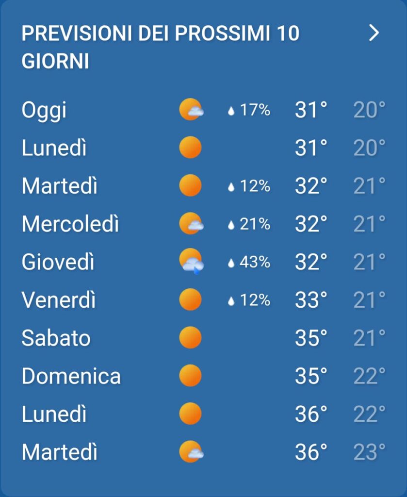 Giornata caratterizzata da tempo stabile con qualche nuvola che potrà oscurare il sole per alcuni momenti. Nessun fenomeno previsto. Andiamo a vedere piú nel dettaglio: nella prima parte della giornata cielo sereno, la temperatura di inizio giornata sarà di 23°C; nel pomeriggio poco nuvoloso, in serata cielo sereno, le temperature pomeridiane saranno di circa 31°. L’altezza dello zero termico è previsto intorno ai 4300 metri stabile nell’arco della giornata